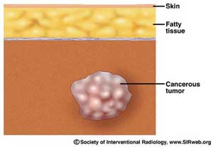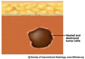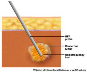In this procedure, the interventional radiologist guides a small needle through the skin into the tumor. From the tip of the needle, radiofrequency energy (similar to microwaves) is transmitted to the tip of the needle, where it produces heat in the tissues. The dead tumor tissue shrinks and slowly forms a scar. The FDA has approved RFA for the treatment of liver tumors.